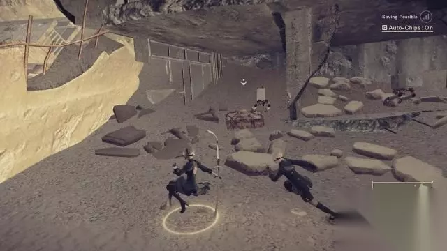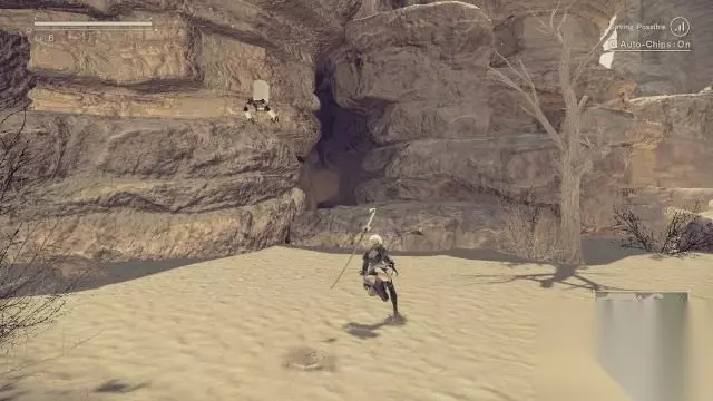 step22.这时候两人要逃到上层的洞口内关键是在洞口前会有一段塌陷的道路,需要快速奔跑通过。 在山洞的分岔口(朝向大沙漠)可以找到一个上锁的宝箱(9/9)。 去到山洞出口处,推动一个机械立方体。接着2B跟通信员6O汇报,她表示刚才他们遭遇到人、人造人、机械人混合而成的敌人,而6O只是作了简单的记录。 走出沙漠回到城市废墟,9S提议2B回到抵抗军营地稍作调整再进行任务。