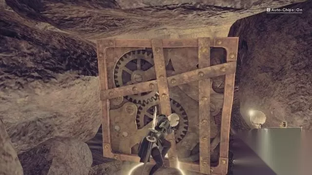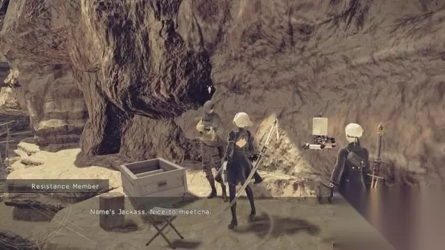 step15.在地底管道旁边找到抵抗军的接头成员——混蛋,混蛋会炸开前方入口的大门,大批机械人就藏在那片沙漠当中。 穿过狭窄山谷,接下来2B和9S需要沿着管道寻找5批沙漠机械兵并击退他们。