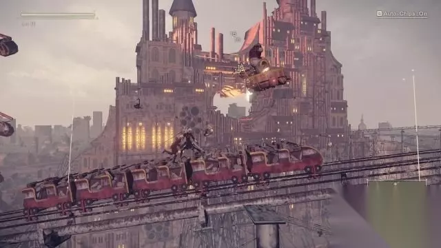 step8.接着登上过山车月台,就会有一辆列车驶至,跳到列车上,列车就会开始行使。 在列车行使期间,会有机械兵出现,这时要在列车上迎战,2B和9S是不会掉出列车外头所以可以随意跑动和跳跃。