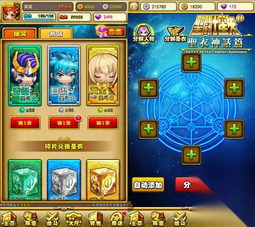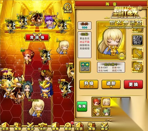 酷炫圣衣助力 还原经典战斗 《圣斗士2》之中的圣衣,不止能大幅提升战力,暴增属性,玩家集齐成对成套的圣衣,更能激发圣衣潜在的套装效果,获得更大的战力加成!同时每个圣斗士不受圣衣专属的限制,使得玩家可根据自己队伍的构成,圣斗士的特性,玩出最棒的混搭Style! 在游戏中,圣衣分为青铜、白银、黄金三个等级(小编偷偷地告诉大家,据说之后还会开放海圣衣、冥圣衣和神圣衣哦!)圣衣按照品阶,可以获得不同的进阶机会,青铜圣衣可进阶1星,白银圣衣可进阶3星,最强的黄金圣衣可最多则可以进阶5星! 圣衣在进阶后将会解锁更多的属性加成,获得更强大的女神祝福!