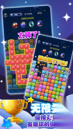 这是一款充满趣味的消除益智游戏。在游戏中,玩家要通过消除星星来达成目标关卡所设定的分数要求,只有成功达到指定分数,才能顺利通关。玩法轻松易懂,独特的魔幻风格为游戏增添了别样的魅力,新奇又有趣。经典的消除玩法搭配新颖的创新道具,让游戏乐趣无穷。当玩家达成目标分数顺利通关后,可以转动一次转盘,有机会获得分数奖励或者实用的游戏道具。 高速下载 普通下载 以上便是关于2025年备受瞩目的星星游戏的介绍。这段星星主题的奇妙之旅暂时画上了句号,但那些闪耀的瞬间已深深烙印在心底。每一次成功突破关卡带来的喜悦,都化作了珍贵的回忆。玩家满心期待着下一次再度踏入这片璀璨星空,凭借智慧为墨,续写更加绚丽的消除篇章,重新踏上新的征程。