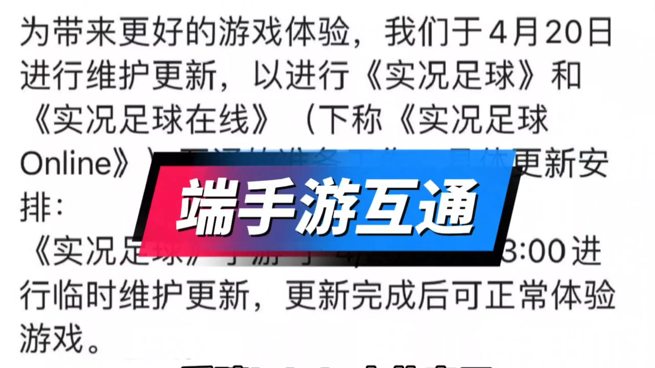 《实况足球》官宣端手互通,4月20日《实况足球》手游临时维护,《实况足球Online》停服维护,期间开放先行服删档测试供玩家体验互通,4月27日《实况足球Online》更新后,玩家可用同一网易通行证实现端游手游同角色体验。