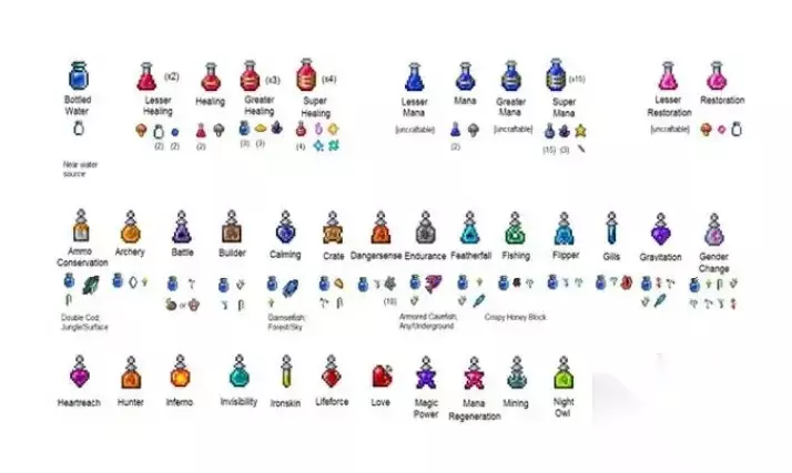 泰拉瑞亚1.4版本的药水合成表:恢复药水:生命药水:微量生命药水+发光蘑菇;魔法药水:微量魔法药水×2+发光蘑菇;恢复药水:生命药水+魔法药水;增益药水:黑曜石皮肤药水:瓶装水+火红花+粉蝶花+黑曜石;再生药水:瓶装水+太阳花+蘑菇;迅捷药水:瓶装水+闪耀之根+仙人掌;鱼鳃药水:瓶装水+粉蝶花+珊瑚 铁肤药水:瓶装水+太阳花+铁矿石;魔法再生药水:瓶装水+月光草+太阳花+坠落之星 魔力药水:瓶装水+月光草+死亡草+坠落之星;