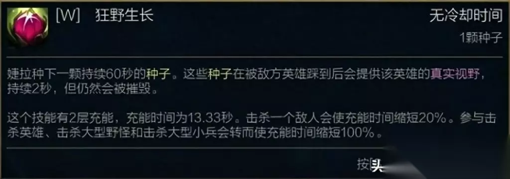 出装:兰德里的苦楚+法穿鞋+痛苦之拥+冰杖+鬼书/帽子+法穿棒 加点:主Q副E,有大点大。 出装解析:消耗型英雄双面具自然是唯一选择,就像炸弹人一样,再怎么debuff再怎么刮痧,出了面具后这种带AOE伤害的英雄整局游戏输出都不会太低。况且面具神话被动还提供技能急速。 冰杖让婕拉植物攻击带减速效果,能戳更多下,也能很好限制敌人走位,方便队伍拉扯。 第四件对面吸血厉害出鬼书,其它情况憋帽子。 最后一件法穿棒提升伤害。 玩法简介 婕拉消耗手段主要靠种子,所以下面着重介绍怎么快速获得种子。 婕拉种子获取来源有两个:被动和W技能。 被动会每隔一段时间在婕拉附近随机位置生成种子,生成CD随婕拉等级提高减少,被动生成的种子只存在30秒,婕拉躲在草丛的时候不会生成种子。 当婕拉有被动的时候就不要躲草丛阴人了,出来先把被动种子种了再说。 W技能种的种子则很厉害多了,先看图。