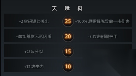每级提升致命一击伤害200/325/450%,概率15%。 技能解析:PA唯一的被动技能,也是其输出的保障。恩赐解脱是个成长性非常高的技能,对于攻击力加成的正反馈很高,也因此客观限制了PA对于攻击装的需求。初始攻击和装备一般的情况下,1级的恩赐解脱效果很差,甚至不如剑圣的剑舞,因此前期该技能更多的作用是提高Farm效率。恩赐解脱由于暴击倍数非常高,对付低甲的敌方酱油威慑力很大,通常出装下后期也能造成一镖1500+的伤害,在团战消耗方面能造成意想不到的效果。 Tips: 1.恩赐解脱的暴击继承的是白字+绿字攻击。 2.恩赐解脱的触发概率是伪随机公式。 天赋选择