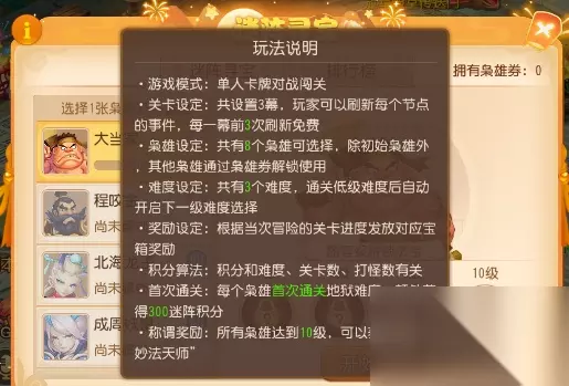 【玩法概述】 每人每天有两次挑战机会,失败可以无限重来(打不过的可以刷脸QAQ) tips:累积上限次数为6,想冲排行的小伙伴,攒满6次就要记得打哦 玩家一开始拥有一个初始枭雄——大当家(人族),后期解锁需用枭雄券,然后就是打怪升级打boss冲排行or佛系混积分,每个种族的等级法宝不一样,主牌也不一样,这就使得我们需要根据其特性进行安排牌组以便更好的打怪。 一个枭雄有3个难度,每个难度有三幕,通关低级难度后开启下一个难度选择,得打过了简单模式才有困难模式…… 【举个栗子】: 大当家法宝以输出为主,则我们需要续航的牌&0耗牌,蝎子精放毒为主,妖皇自残输出流。需要我们在选择卡牌的时候有所取舍(宁缺毋滥,没用的/不好用的宁可不拿)