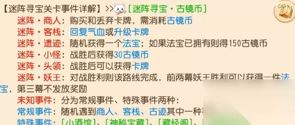 所以,如果要想有高积分,就是要尽可能的刷出多的怪物关卡并把他们捶了,每幕有3次免费刷新机会。(当然,主要还是刷出来且能打过,所以各位兄弟要根据自己的实际情况来使用迷阵刷新的功能) 卿:我就不一样了,我刷怪不是为了刷分……谁让我打不过! (最后两个关卡不可刷新,所以如果真的状态很差,建议在前一两关就刷一下客栈啥的,大佬无视这条=。=) 【迷阵事件】