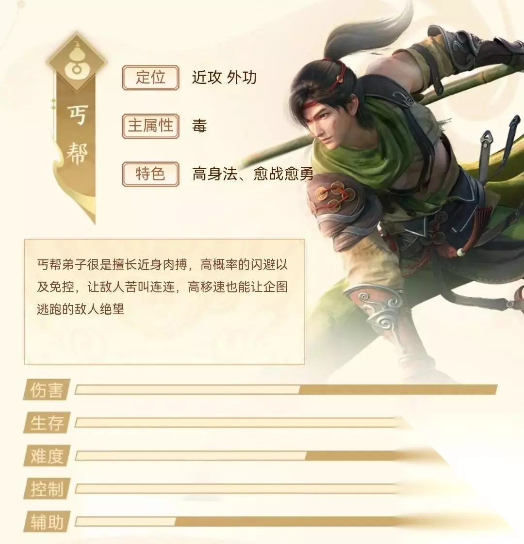门派介绍 定位:近战,外功 主属性:毒 特色:高身法、愈战愈勇 简介 1、丐帮弟子很是擅长近身肉搏,高概率的闪避以及免控。 2、高移速也能让企图逃跑的敌人绝望。 基础面板 1、高生存,高控制。 2、中等难度,中等生存能力,低辅助能力。