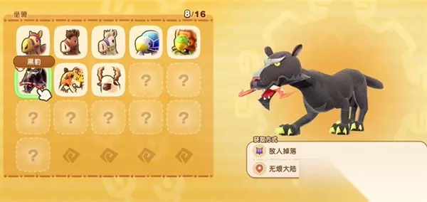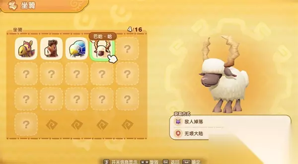 二、怪物掉落类 以下坐骑需击败指定野怪,有一定概率掉落: 1、甲壳龟 刷怪位置:无垠大陆 – 刷甲壳龟位置 2、森林豹 刷怪位置:无垠大陆 – 森林豹区域 3、山羊咩 刷怪位置:无垠大陆 – 山羊咩分布区 4、巴哈·哈 刷怪位置:无垠大陆 – 巴哈·哈出现区域