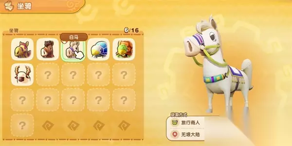 幻想生活i全坐骑获取方法汇总 一、商店购买类 1、棕马 获取方式:前往森林地区素材店购买。 2、乌龟 获取方式:在悦夏群岛素材店购买。 3、白马 / 黑马 获取方式:在无垠大陆的旅行商人处购买。