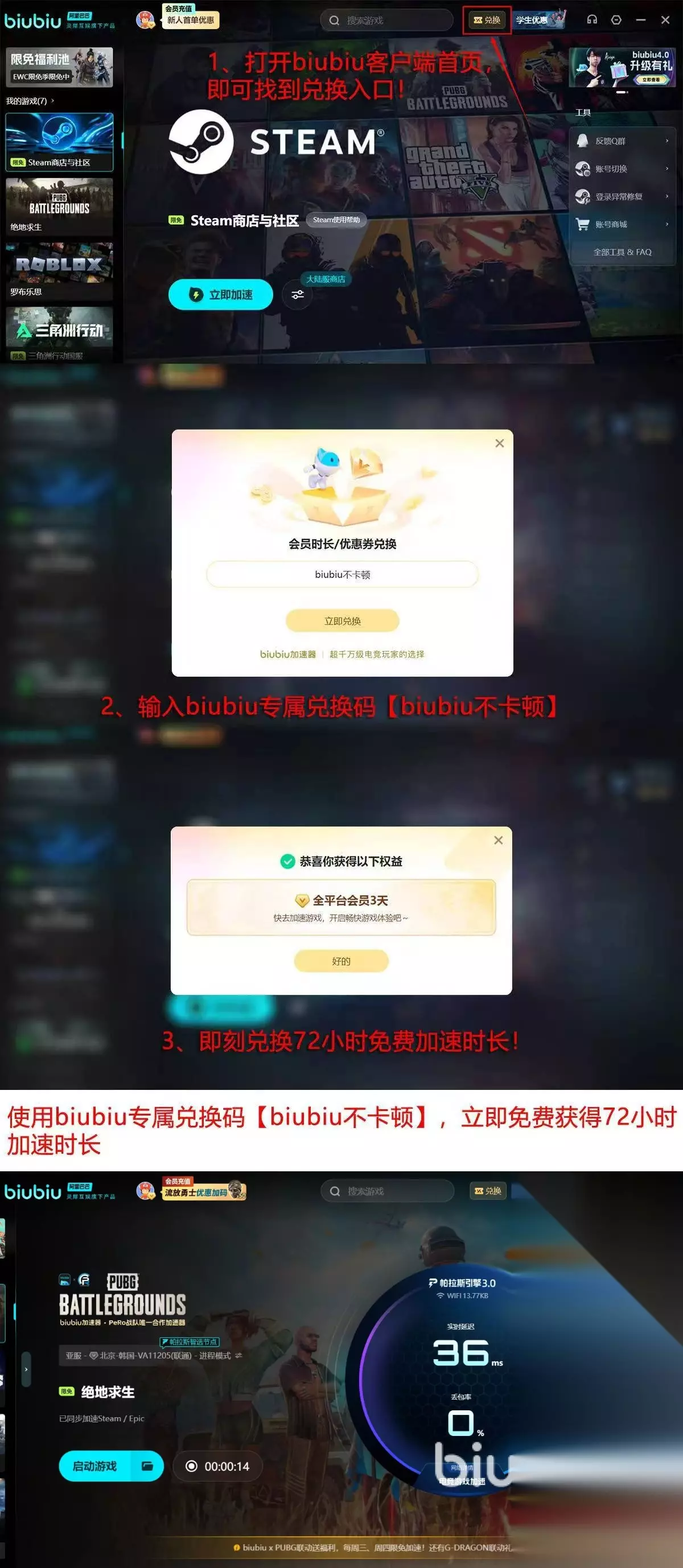 新用户立刻可以享受到重大优惠,注册成功之后首日激活24小时全功能免费试用,输入【biubiu不卡顿】再加72小时加速时长。轻松操作,新人累计畅享长达96小时优质加速体验,是跨越网络障碍、重返刺激战场的高效起点。