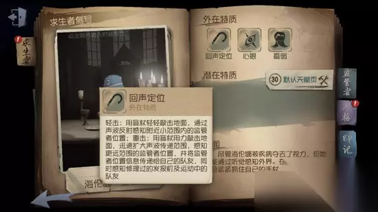今天小编来为大家介绍一下《第五人格》中的文学家——盲女海伦娜亚当斯。世界为你关上一扇门的同时也会为你打开一扇窗。虽然盲女出场的时候整个视角都会变得灰暗,但是她可以利用拐杖的回声来确定监管者和队友的位置,是一个不错的探子。 海伦娜亚当斯 职业:文学家 物品:盲杖