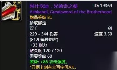兄弟会之剑 拾取后绑定 双手剑 229-344伤害 速度 3.50 (每秒伤害81.9) +33耐力 需要等级60 装备:+86攻击强度。 "刀柄上刻有大写字母A.L."