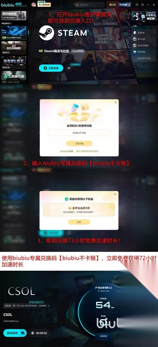 福利方面更是丰厚,使用“biubiu不卡顿”这个口令码就可以换取3天的全平台会员,这个口令码是新人老玩家都可以使用,不过仅限一次,输入的时候注意biubiu要小写。然后还有新用户完成注册后领取的24小时免费加速时长,这个是自动领取的,也会随时间自动消耗。不过,这样对新人来说就是足足近百小时的体验时长了,很少有同类产品会给到这么多。