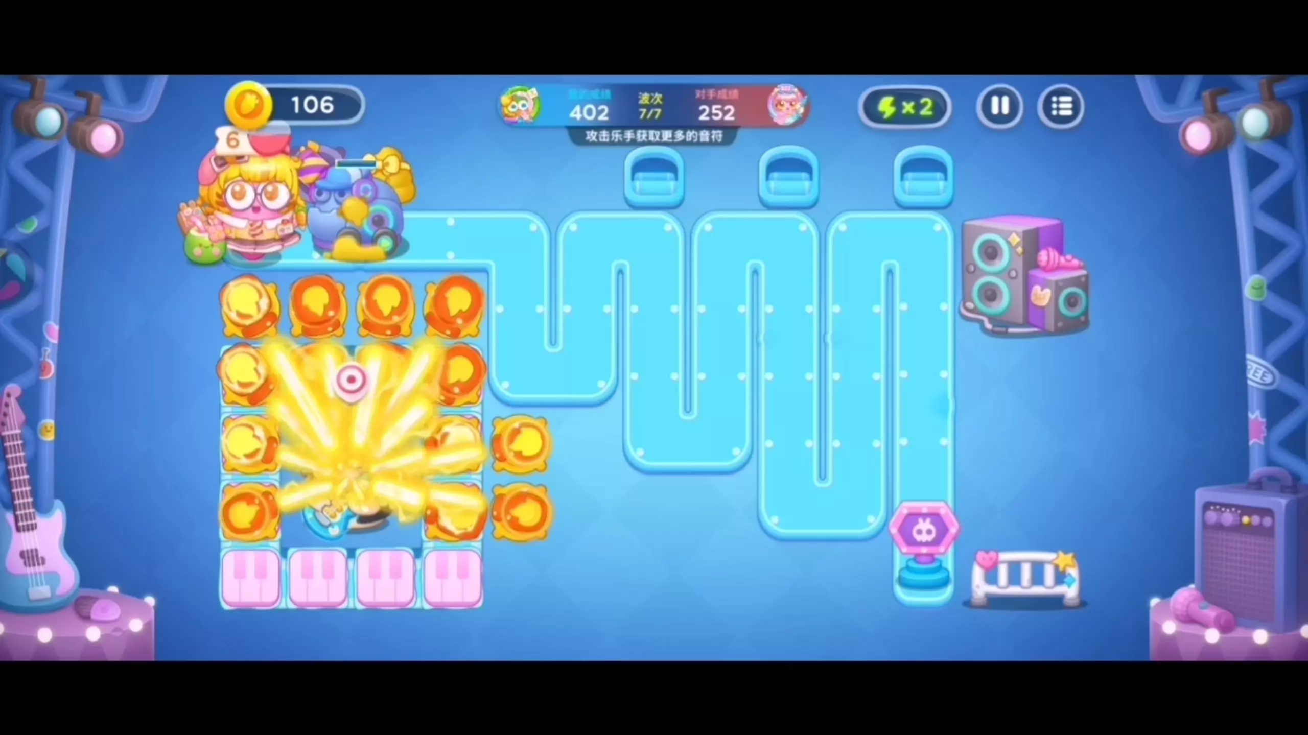 这是手游《保卫萝卜4》的星途101玩法,推出了史上首张双乐手地图,该地图里乐手数量更多,音符获取上限也更高,玩家可通过攻击乐手获取音符,还能进行炮塔锁定、刷新等操作来挑战关卡。