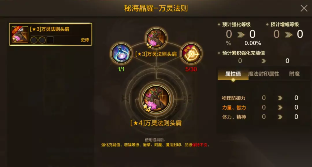 (素材源于测试服,请以正式服上线版本为准) 秘海晶耀 消耗秘海晶耀*1+史诗灵魂*30,可以将75级3星史诗装备升级为同部位、同套装的4星史诗装备。