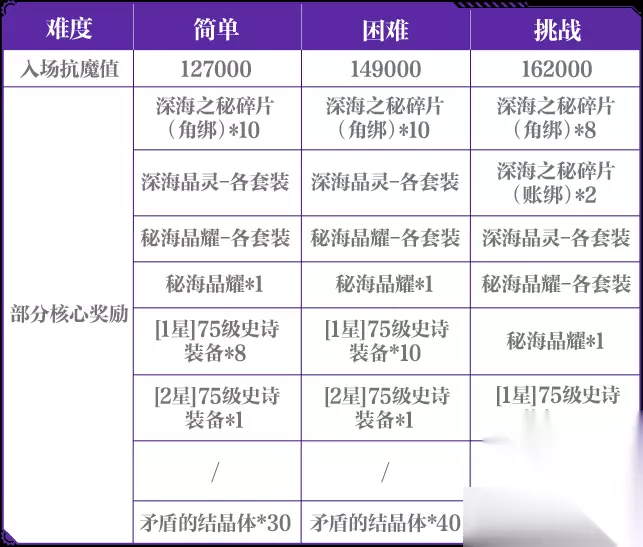 (素材源于测试服,请以正式服上线版本为准) 角色达到80级并满足入场抗魔值后即可挑战,不同难度对应不同的入场抗魔值要求,勇士们可点击下方表格进行查看: