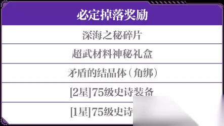(素材源于测试服,请以正式服上线版本为准) 通关奖励 ✦ 通关悔恨之海,必得深海之秘碎片、超武材料神秘礼盒、矛盾的结晶体(角绑)、[1星]75级史诗装备、[2星]75级史诗装备奖励。 还有机会获得深海晶灵-各套装、秘海晶耀-各套装、秘海晶耀、神器卡片、宇宙精华、自选礼袋等奖励。