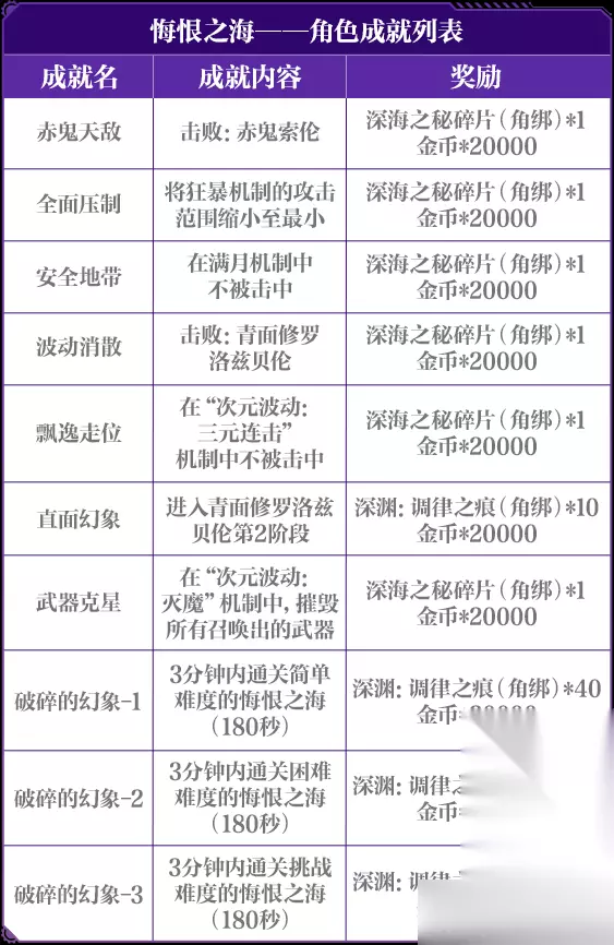 (素材源于测试服,请以正式服上线版本为准) 玩法成就 ✦ 挑战悔恨之海时,勇士们达成一定的条件即可完成对应成就,如下所示: