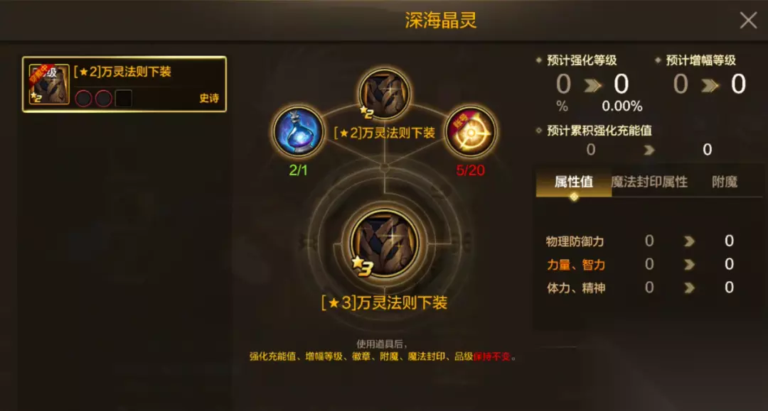(素材源于测试服,请以正式服上线版本为准) 深海晶灵 消耗深海晶灵*1+史诗灵魂*20,可以将75级2星史诗装备升级为同部位、同套装的3星史诗装备。