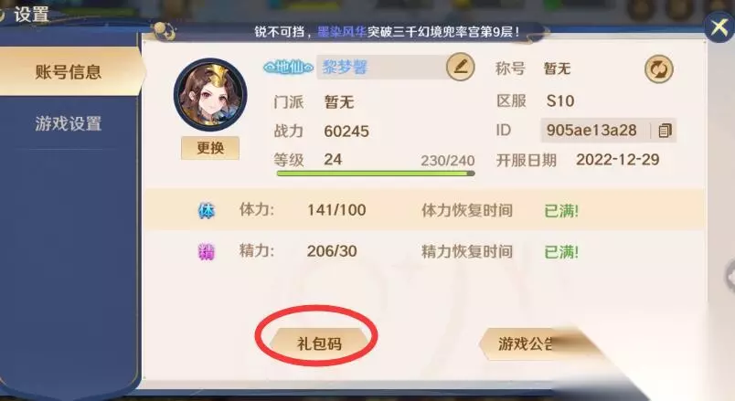 3、我们在账号信息页面,就可以看见【礼包码】的功能选项,点击进入。 4、接着我们就进入到兑换页面,把礼包码输入进去就可以领取到游戏奖励了。
