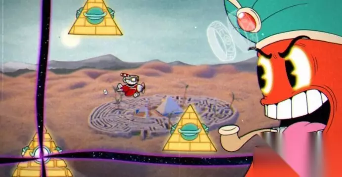第二阶段boss会变化成大柱子不断逼近玩家,触碰到就会受伤,柱子上方带人脸的部分是可以攻击的,打掉之后就可以顺利通过了,在移动过程中需要注意两侧移动的陷阱。第三阶段boss会变化成一个大棺材,棺材会召唤出幽灵和眼球发动攻击,只有攻击躲在棺材中的头部才能造成有效伤害,这时候可以走到左上角使用导弹武器无伤通过。第四阶段boss会变化成一个木偶人,此时他的帽子会一直追踪玩家并且随机发射子弹,木偶本体也会发射子弹其中有少量是粉色的可以格挡。最后一个阶段boss开始变化成一个巨大化的神灯,空中会出现三个金字塔绕着玩家转圈,从金字塔的眼球处会释放射线。