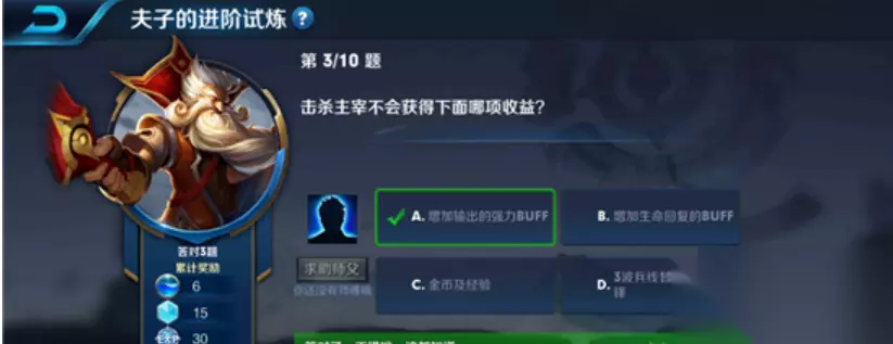 王者击杀主宰不会获得增加输出的强力BUFF收益,这道题是夫子的试炼中的一道题目,对于击杀主宰获得收益还是比较多的。那会获得什么收益呢。