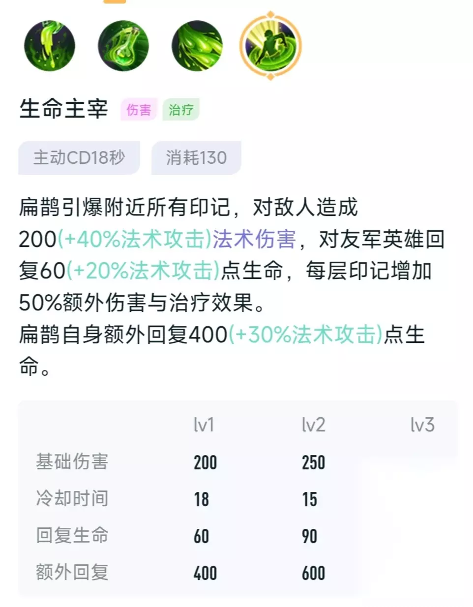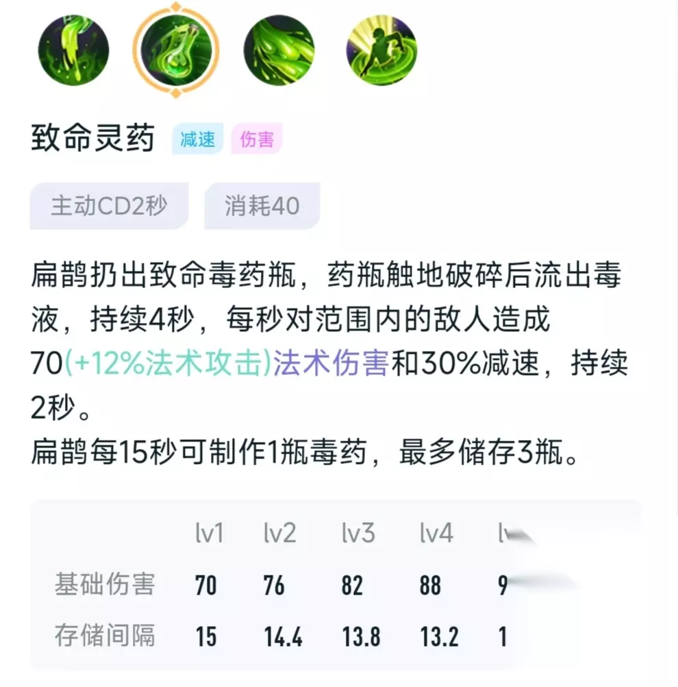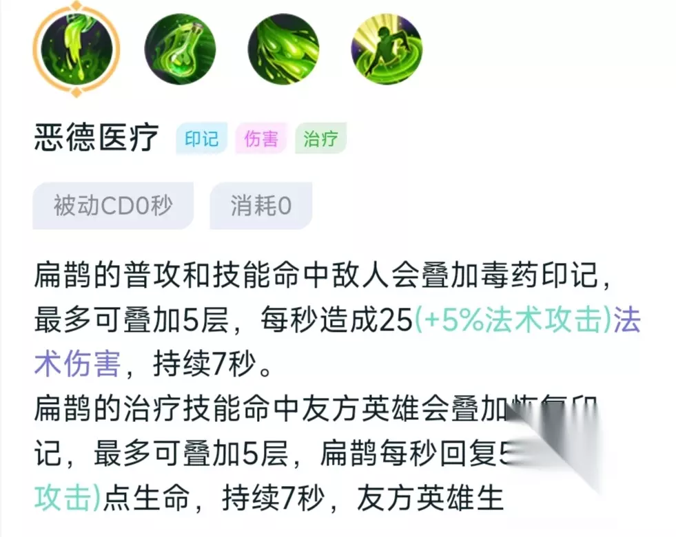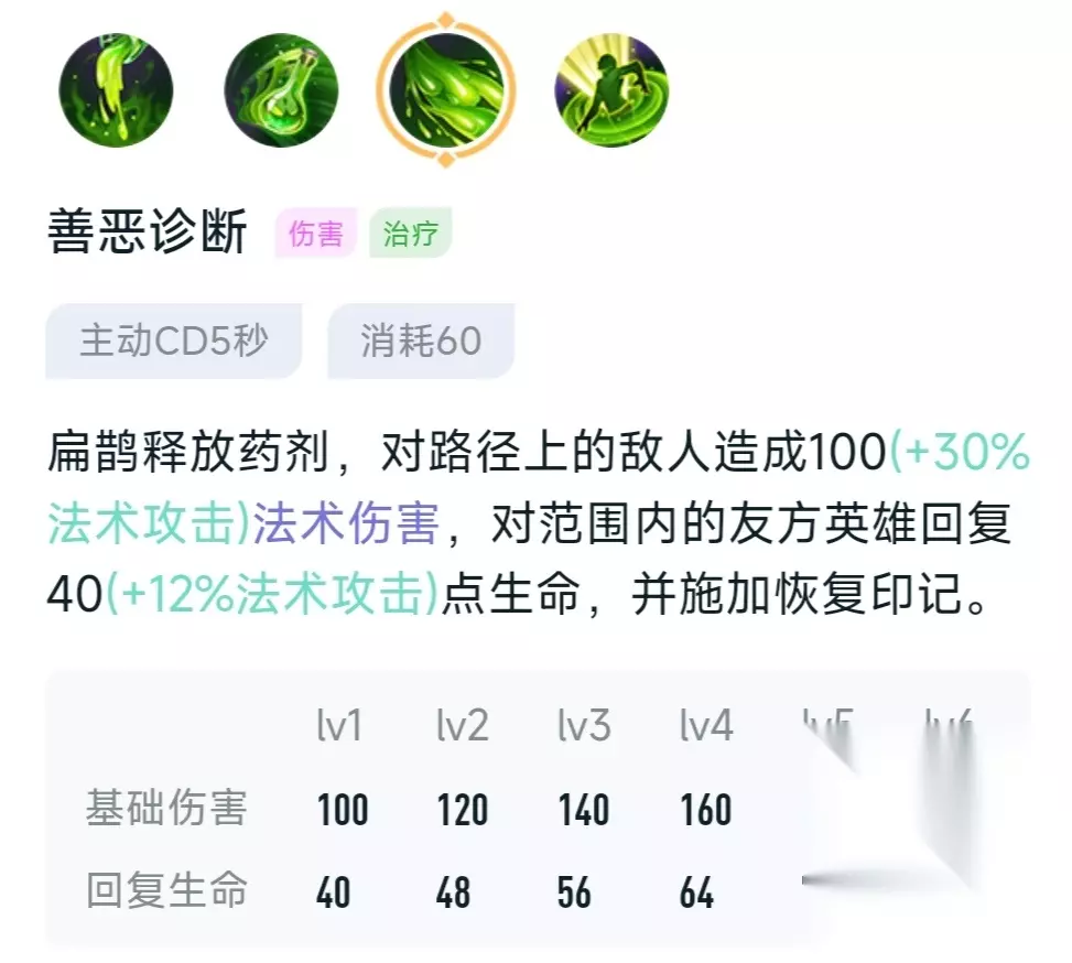 首先是被动,扁鹊的普通攻击,还有技能命中敌人会增加印记,而且印记越多伤害也就越高,最多可以叠加5层,并且可以对敌人造成持续7秒的伤害,在此期间再给敌人叠加印记,时间会重新开始计算,当扁鹊在队友身边释放二技能回血时也会给自己和队友增加印记,印记越多回复的血量也就越多,同理这也能持续7秒。 技能一:致命灵药