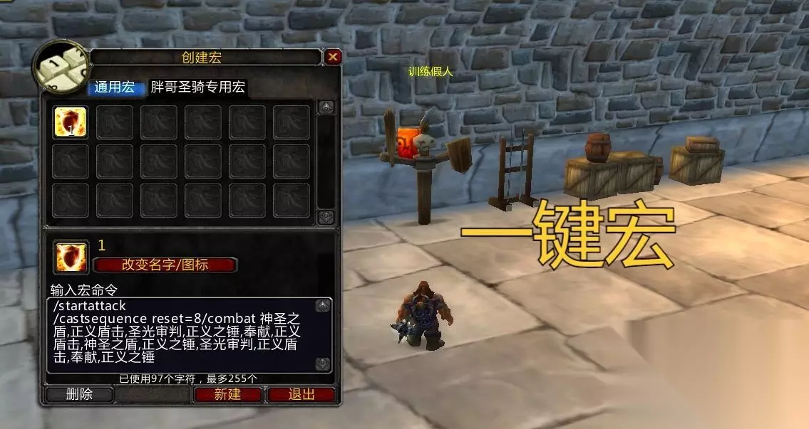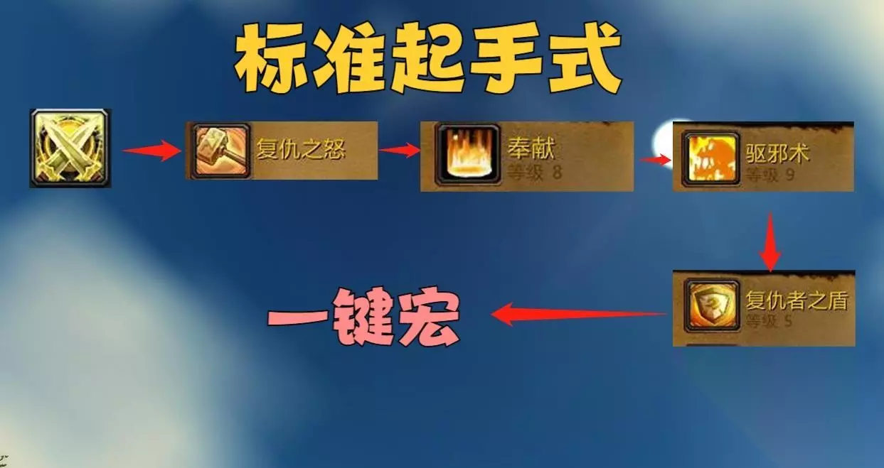 起手阶段:使用复仇圣印(腐蚀圣印),然后开启复仇之怒,地上踩奉献,读条驱邪术,瞬发复仇者之盾。这套技能打出去之后,就可以使用一键宏了。 所谓的一键宏就是把防骑的常用技能以6/9秒循环的方式设置序列施法,让技能按照玩家预设的方式依次释放,在拉怪的过程中只需要按一个键就可以了。