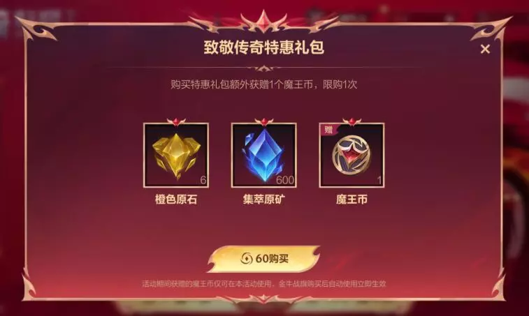 即日起,截止至2026年1月14日,召唤师花费60点券即可购买致敬传奇特惠礼包,限购1次,礼包包含魔王币*1、橙色原石*6、集萃原矿*600。