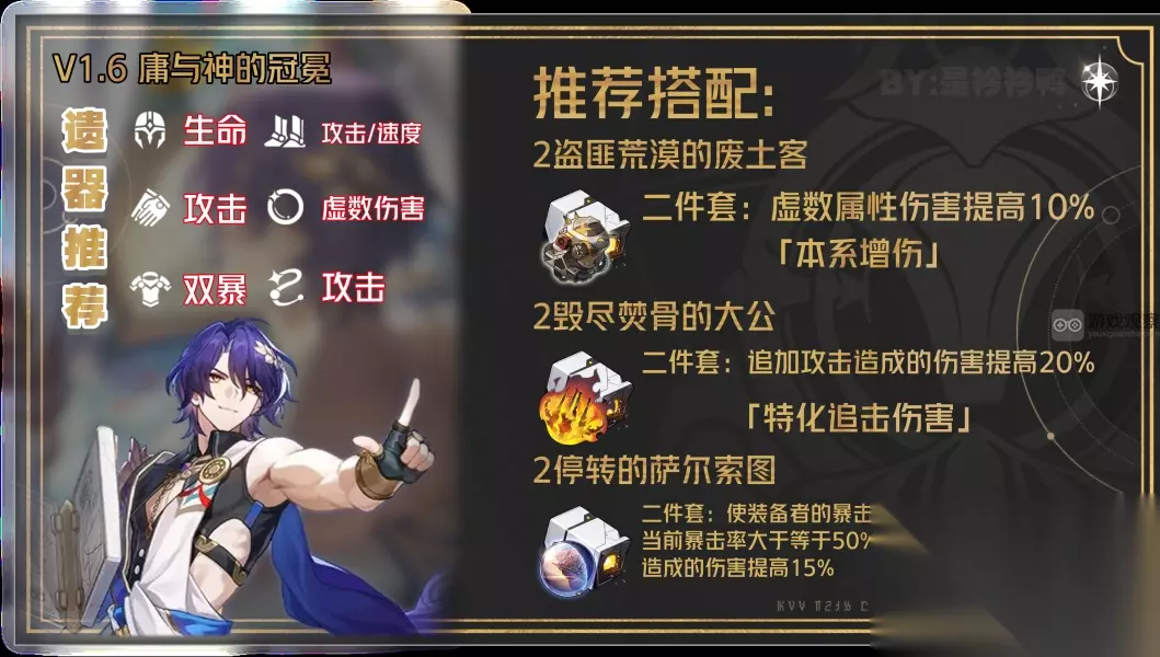 1、在前瞻中可以得知,真理医生是一个主追击/终结技进行输出的巡猎虚数C。既然涉及到了终结技和追加伤害,那么二件套自然是要绑定萨尔索图了 2、由于虚数属性和追击伤害的属性,2虚数2大公是大于其他套装的收益的(估算约为3%)。那么有的开拓者就会问了:四大公/四虚数可以不可以?答案是肯定的。这两个套装的四件套效果都相对比较适合真理医生,因此真理医生的套装搭配会灵活很多,相比于希儿这类原始C则更加容易毕业 3、那又会有开拓者问了,为什么不带2繁星啊?原因很简单,就目前的演示视频来看,真理医生的追加攻击占比相当大,在对面有debuff的时候就可以很稳定的触发追加攻击。而且相比于萨尔索图,繁星对于暴击率的要求相当高,并不太好吃到二件套的效果。因此在此只推荐萨尔索图