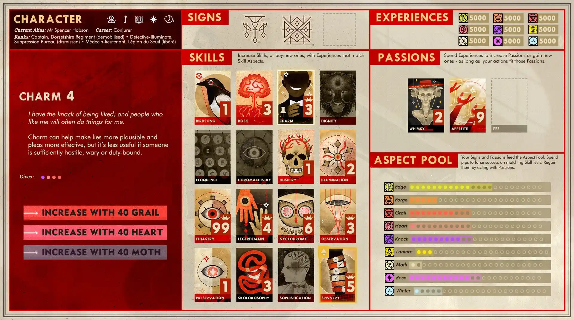 从十六种截然不同的技能中塑造你的角色。尊严对于需要被严肃对待的医生至关重要。油滑术是冷酷世界中确保一顿热饭的唯一方法。任何作家都会告诉你,老练世故总有用武之地。而众所周知,悖知学是研究那些本不该被研究之物的学问。