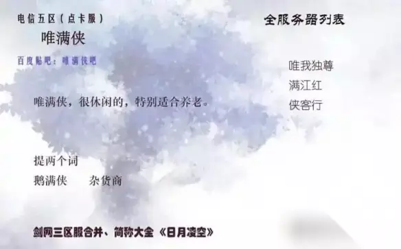 剑网3唯满侠是哪个区呢?它隶属于电信五区,是唯我独尊、满江红和侠客行三个服务器合并而成的。历史上的唯满侠曾多次发生大型阵营战,现在它是一个休闲养老的好去处。