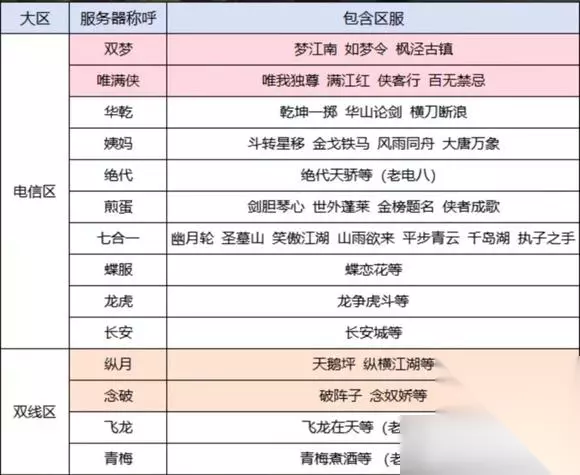 剑网3区服简介: 电五双梦(梦江南)上线就排队,已绝育 电五唯满侠(唯我独尊)鹅服,已绝育 电五华干(干坤一掷) 电八绝代(绝代天骄)地狱之门 电五姨妈(斗转星移) 双一纵月(天鹅坪)男同服 双一念破(破阵子) 电五煎蛋(剑胆琴心) 电五七合一(幽月轮) 电一龙虎(龙争虎斗) 电一长安城(长安城) 电一蝶服(蝶恋花) 双四青梅(青梅煮酒) 双二飞龙(飞龙在天) 无界有人赴约 无界山海相逢 无界万象长安 无界自当狂 无界眉间雪 无界九万里
