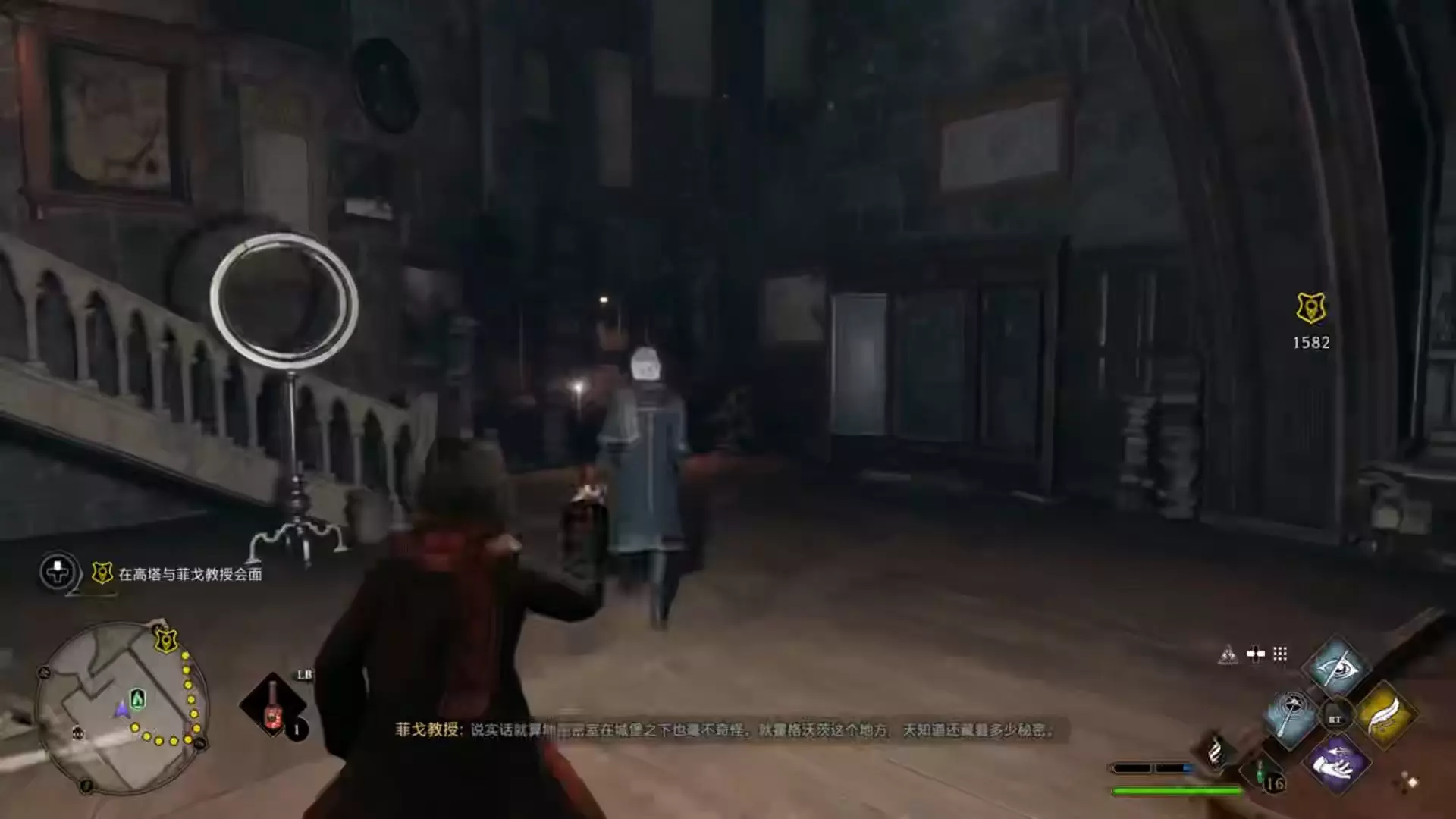 这是《霍格沃茨之遗》的黑巫师结局游戏实况,展示了玩家角色独吞古代魔法的剧情,画面中可见菲戈教授,他提及米莉安对古代魔法的看法,呈现了该结局的相关场景。