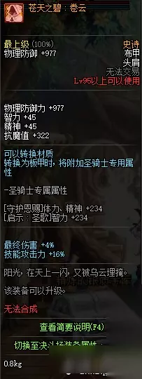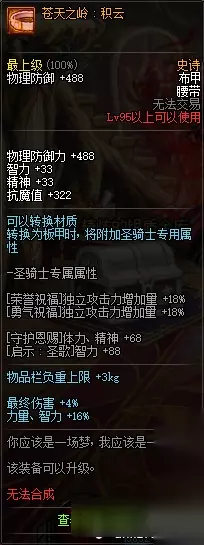 物理防御+488 智力+33 精神+33 抗魔+322 物品栏负重上限+3kg 最终伤害+4% 力量、智力+16% 95史诗布甲苍天之隙:高积云属性: