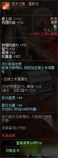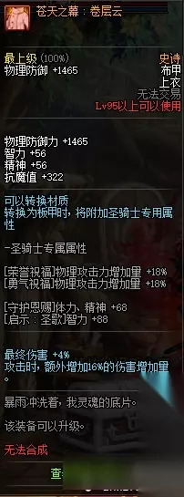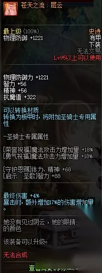 物理防御+1465 智力+56 精神+56 抗魔+322 最终伤害+4% 攻击时,额外增加16%的伤害增加量。 95史诗布甲苍天之流:层云属性: