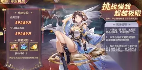 活动期间,分别在活动第1日,第3日,第5日分别开启【疾风骤雨】、【无尽怒潮】、【以柔克刚】三个阶段的奇策挑战。在本活动中,诸葛果、王元姬的最终攻击、最终防御增加20%,并且本活动中所有武将的属性与养成将被调整为固定值。 每日可对当阶段的强敌进行挑战,当日达到一定累计伤害即可获得祈愿星币,祈愿招募券等奖励。 玩家在每个挑战阶段造成的最高伤害会进行排名,造成最高伤害排名前3000的玩家,均可获得祈愿招募券、祈愿星币、元宝等奖励。