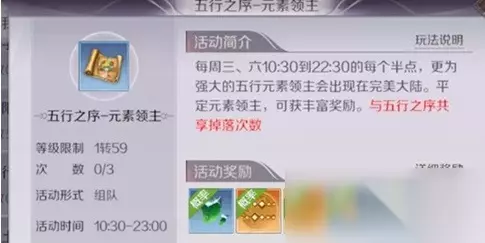 活动简介 参与等级:1转59 活动次数:开启日可以获得3次挑战成功奖励 开放时间:每周三,周六的10:30—23:30之间的每个半点刷新 领主出现场景:疾风草原1阶-3阶,龙战之野4阶-6阶;新增7阶-9阶元素领主出现场景为:祖龙城郊7阶,寻梦港8阶,积羽城9阶。 元素领主简介 元素领主分为金木水火土五种属性,每种属性的元素领主,都有自己独特的技能和打法。五种属性中,比较容易挑战的是水元素和土元素领主。等阶越高,元素领主的基础属性就越高,包含攻击,血量,防御等,修真者可以根据队伍的修为来决定挑战适合自身修为的元素领主。 除了等阶外,元素领主的挑战难点在于各种属性称号,拥有强力称号的元素领主会让挑战难度成倍增加。 修真者在挑战元素领主时,需要了解元素领主头顶称号给BOSS带来的各种属性;高阶的元素领主如果随机的称号比较简单,那么挑战难度会比低阶随机称号困难的元素领主要简单很多。