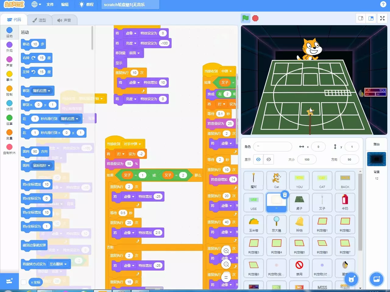 这是第3期自制多人模式恶魔轮盘赌内容,该游戏由编程猫制作,和Scratch类似,采用积木式编程,展示了游戏内的轮盘、枪械、道具等玩法相关内容。