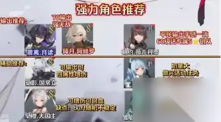而辅助类角色推荐:觅影、早樱、雏心、潮音 这四位角色。 其中觅影 不仅仅可以提供增伤,还有不低的输出,是可输出可拐的角色; 而早樱 则是又能增伤又能回血的多辅助 ,但是由于大国主的回血与增伤都是随机的,所以不确定性比较大,对于追求极限输出的玩家就不建议携带了 。而雏心 则是有输出有奶 的辅助,同时与我们的女主有连携技能可用,所以如果带女主当输出的话,搭配雏心还是一个不错的选择 。 潮音 则是:专职奶妈,虽然能力上没有前几个角色多,但是重在:做完各类活动可以白嫖到欧米伽也就是满阶 ,属性加成和技能加成上,满阶的角色还是很强的,所以平民微氪玩家练完全不亏。