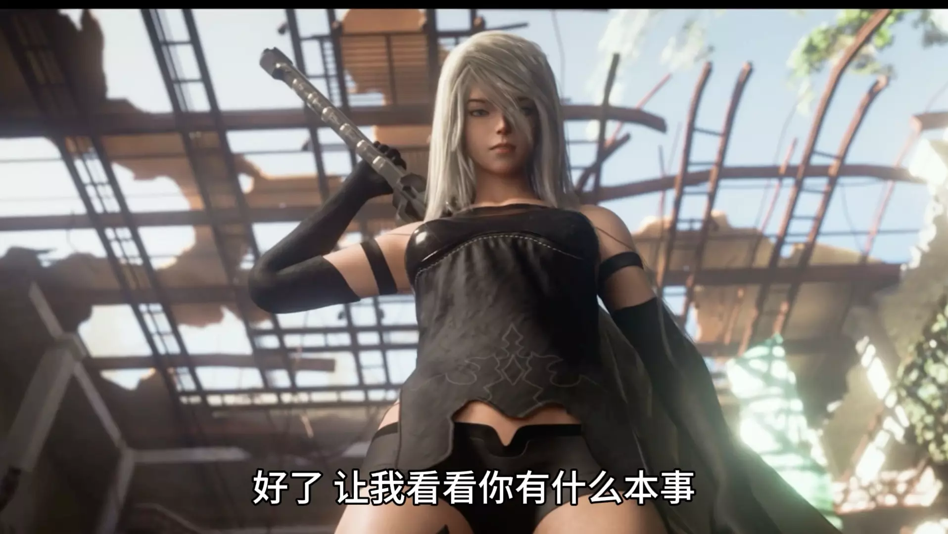 这是一则尼尔系列的同人动画,展示了角色A2与2B在荒废建筑场景中的互动画面,呈现出极具风格化的战斗与角色互动情节,是尼尔粉丝向的同人创作内容。