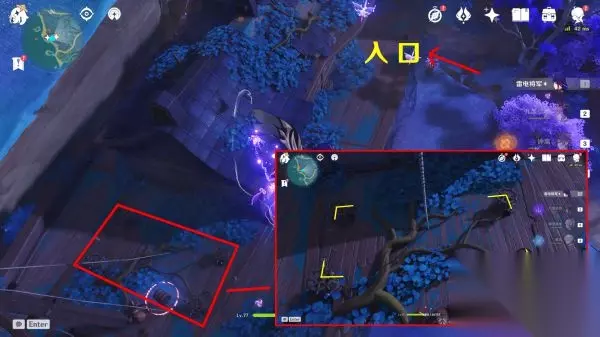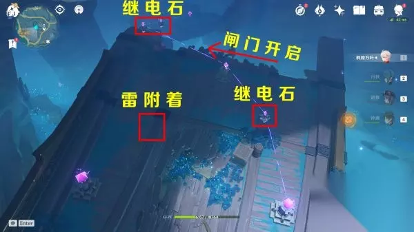 继石头摆放如下图,还需要一个雷附着的角色,方法不一,解谜完,闸门开启,里面有一个华丽宝箱和一个雷灵,触碰它使其归位,雷灵的路线:先在里面绕圈,然后来到船上的相位之门,最后在旁边的雷樱枝条归位