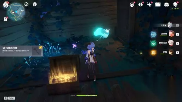 解谜完,我们触碰仙灵,跟着仙灵走,先经过若雷结界,结界内有一个含有钥匙的宝箱,接着指引我们来到上锁的门,最后指引我们去到下一层
