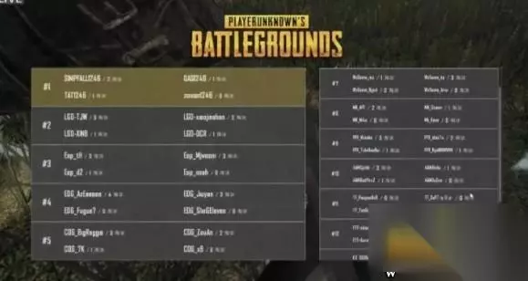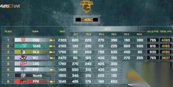 本局比赛前三: 第一名 1246战队 4杀 560分 第二名 LGD战队 9杀 535分 第三名 Eop战队 7杀 465分 本局速况 本局比赛决赛圈刷新在上城区东北野外,场上七支队伍,二十个生存。圈西侧聚集了很多队伍,EDG和COG在山头相遇,圈开始缩小,Eop在反斜卡住FTD,COG进圈被LGD卡住灭掉,此时场上四支队伍,九个生存,圈同心圆刷新,LGD三人,1246和Eop两人,EDG一人,Eop向EDG方向移动将其打掉,蓝圈开始缩小,LGD将Eop灭掉,但1246前来劝架,瞬间将LGD压制只剩一人,3打1的情况下,1246直接拉开扫射,成功吃鸡。 本局排名