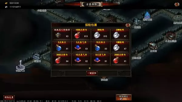 在玩家等级达到30级后,则开放出《古墓探险》系统,每日系统会免费的赠送3次探险次数。古墓探险属于一个产出地集合系统,该系统将会产出元宝,银两,修为,体力,灵珠,佩饰,材料,各种高级物品。 在古墓探险中,可进行单次探险,10次探险,50次探险。在每次探险获得的奖励将会统一存放到探险包裹中,玩家需要在 探险完毕后,打开左下角的【探险包裹】,进行将物品收回角色包裹中。否则将长期存放在探险包裹中,无法使用与获得。 《古墓探险界面》