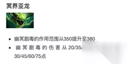 在新的7.21b里面,并没有毒龙的改动。但是作为好久没受到玩家喜爱的英雄来说,我们可以稍微往前找找。在7.21版本里面,毒龙稍微做了一点加强。主要是增加了一点技能的伤害。但是考虑到远程敏捷型英雄在版本里面普遍有些弱势,所以我们可以理解为冥界亚龙在最近几个版本里面没有加强也没有削弱。那么到底这样一个平庸的英雄为什么小编会说他20分钟就可以结束游戏呢? 新式玩法 相信看了狗皇(踏上征途)直播的玩家们都知道这个毒龙的套路了,那就是对线期间不和你中路英雄对线,直接2技能和3技能对点,然后吃小净化钻野区。这时候可以叫一个辅助来顶中路的线,或者是打野的时候顺便去收一下,这样做的结果就是,冥界亚龙的等级跟着时间走,10分钟很可能你要比对面高上个2-3级,这就相当有优势了。之后直接裸出阿托斯之棍,杀翻全场。