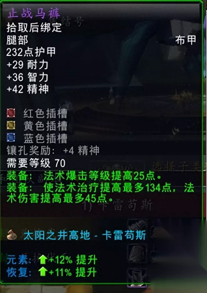 除了以上几个经典掉落之外,我们也要提醒一下大家,在太阳井中不少掉落是可以使用太阳之尘兑换成同甲其他类型的掉落的。比如说卡雷苟斯的止战马裤,就能兑换为激战马裤,从奶牧和奶德极品,变成暗牧极品。