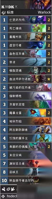 卡组分析 前期主要当动物园来打,前期也是十分的强势,单卡质量都十分的高。后期巫妖王+DK古尔丹强势翻盘,有点像之前的恶魔术(二王版本),另外,可以考虑去掉点杂毛,换成666的地狱火。 卡组代码 AAECAf0GCsUE7QX7BbYH58EC08UCl8sCws4Cl9MCl+gCCjDECPauAt28AqvCAt7EAufLAqLNAvfNAoniAgA=以上就是今天为大家带来的炉石传说冰封王座K神DK术卡组,大家可以一起来试试,更多更全的炉石传说攻略尽情关注当游网,为你带来第一手游戏资讯,带来最新最全的游戏攻略。希望对大家有所帮助,谢谢。