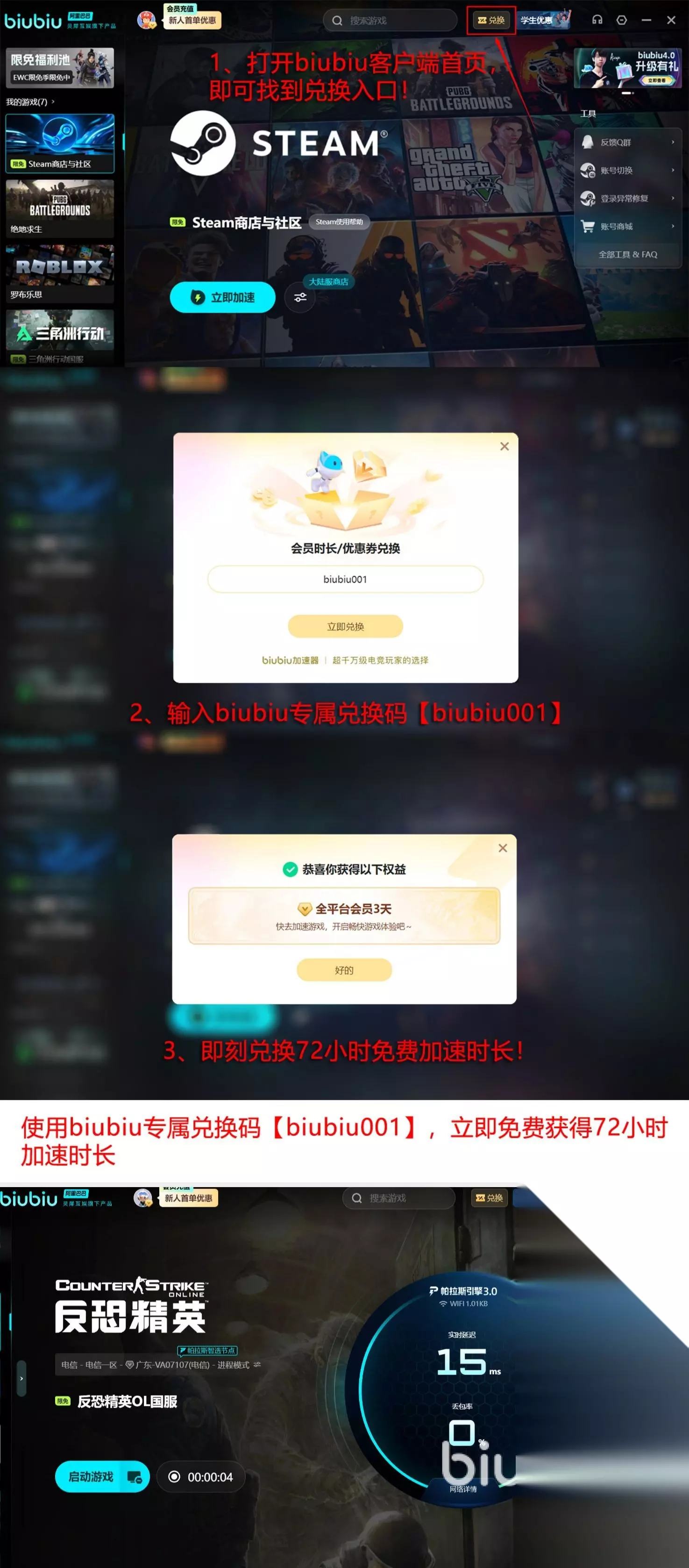 在行业内实力特别出众的biubiu加速器,不仅是pero战队这种专业电竞选手指定训练的专业加速器,除此之外,还依托阿里巴巴灵犀互娱的技术,以及自研的帕拉斯3.0引擎,玩各种游戏的时候都能够享受更强的电竞内核,得到了PUBG冠军选手小叮当的专业认证,解决游戏畅玩过程当中掉线、掉帧、闪退、网络中断等问题。新老玩家如今还可以通过输入口令【biubiu001】免费获得三天加速时长,新用户注册可以解锁24小时的免费加速时长,叠加在一起的话,一共可享受96小时的免费加速时长。